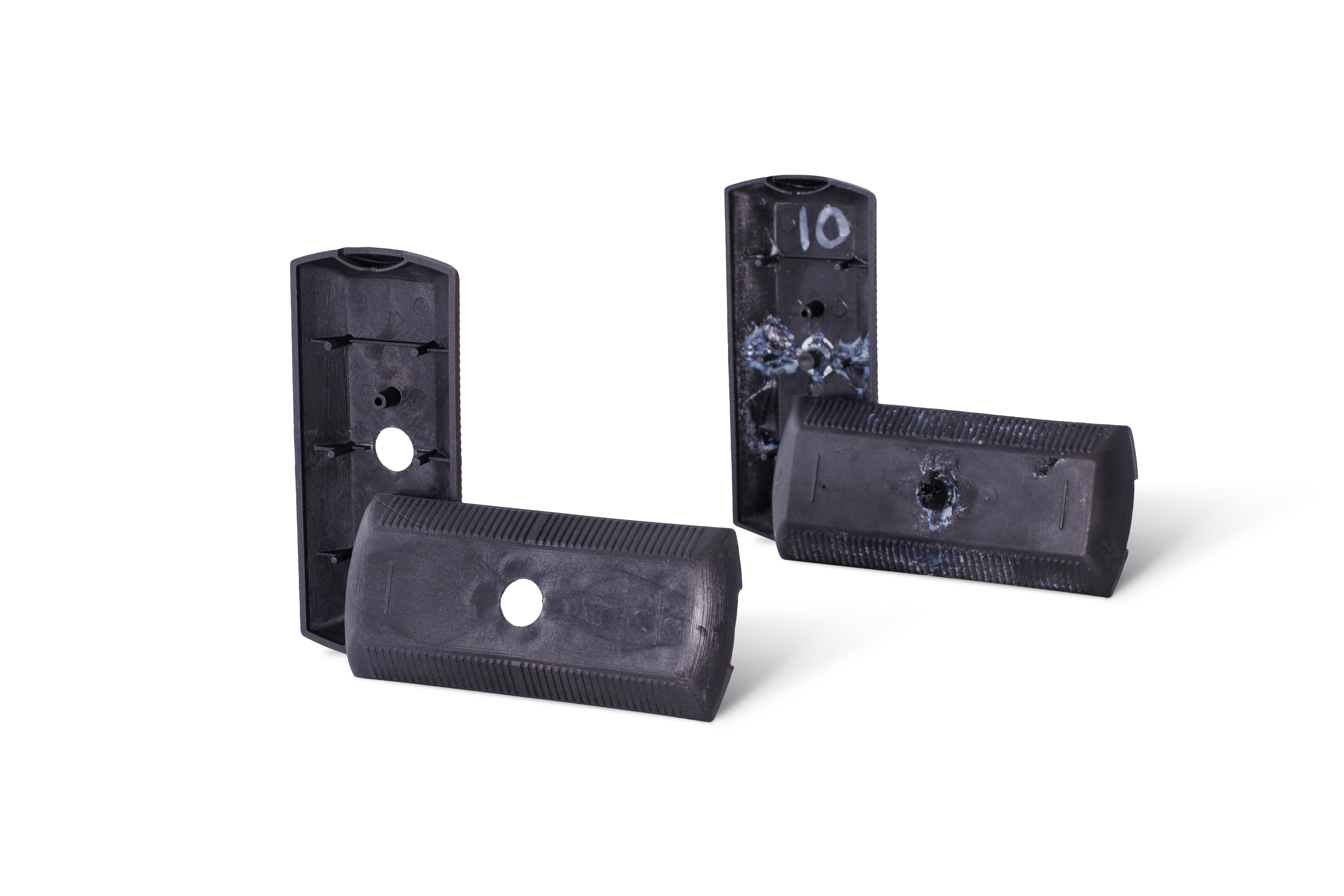 The differences in mechanical and thermal properties of the two materials have an impact on the total number of parts a mold can produce. Under normal opperating condition (after the first 3-4 runs), the 3D printed mold will reach a temperature of approximately 120oC, as it is heated from the melted material. Good thermal stabillity is crucial for minimizing the deterioration of the mold. The PA GF test samples of the image bellow were produced using identical mold designs that 3D printed in the two materials (both show the part produced after the 10th run). The quallity of the part produced with the Digtal ABS mold is much lower, as the mold has started to overheat and deteriorate, while the Somos PerFORM mold was still stable.