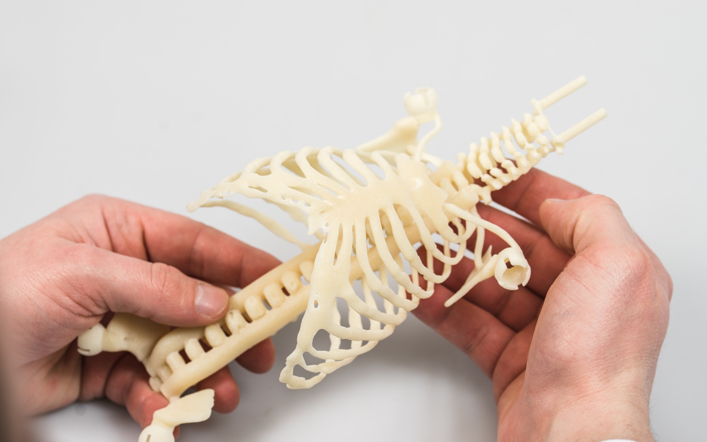 Testing was initially done with various thermoplastic elastomers on a desktop FDM 3D printer to create the larger parts of the model such as the rib cage. After finalizing on a design, Selective Laser Sintering (SLS) was used because of the accuracy and dimensional freedom the technology offers.