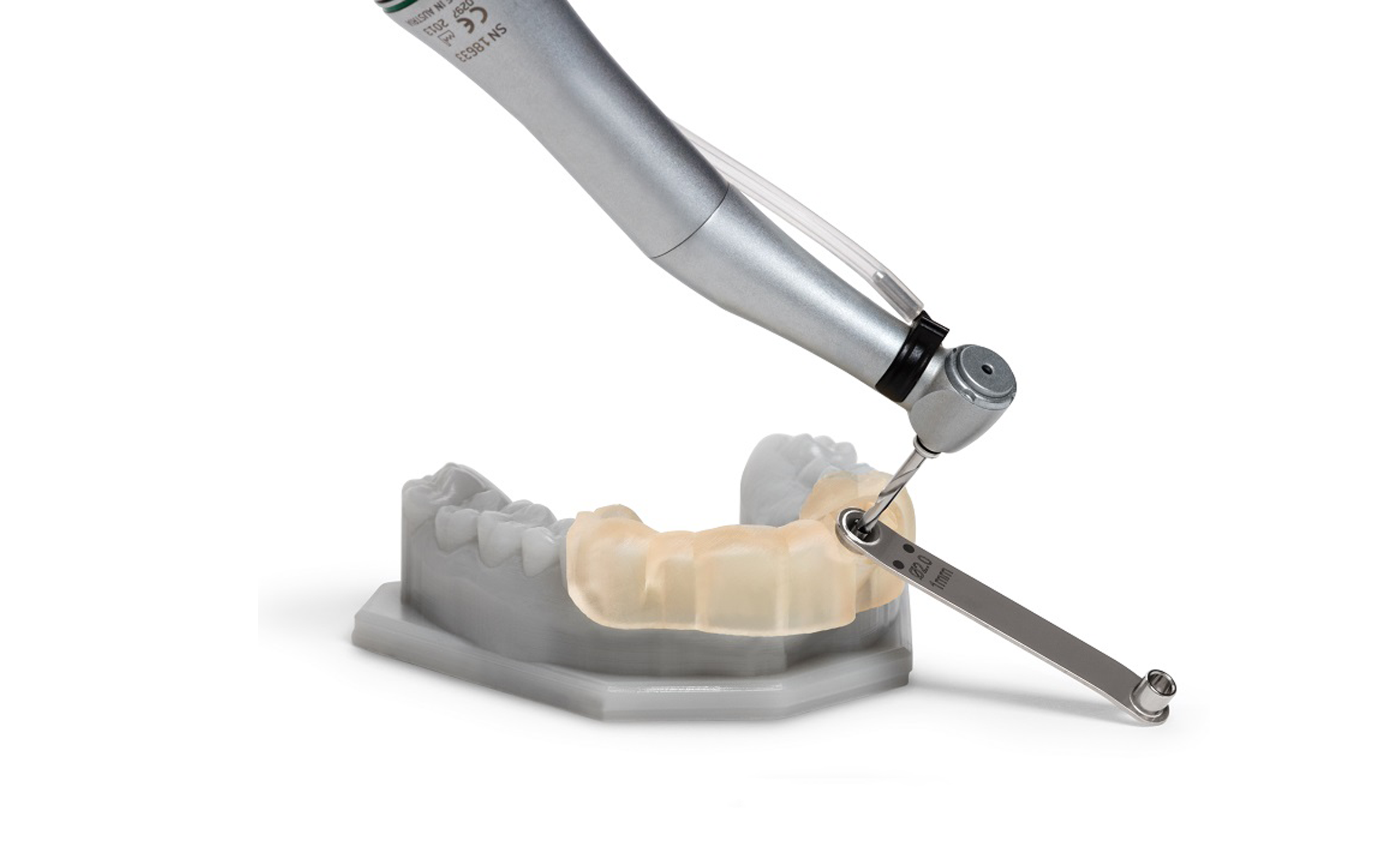 A dental tool guide. Scanning the patients teeth then 3D printing the design allows for the tool to be perfectly located