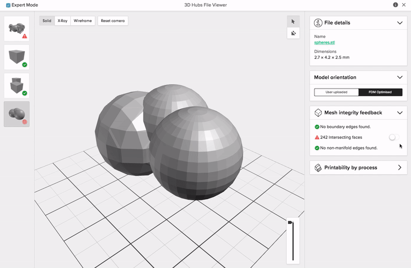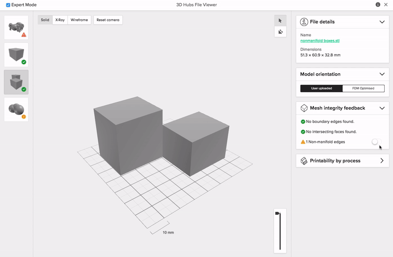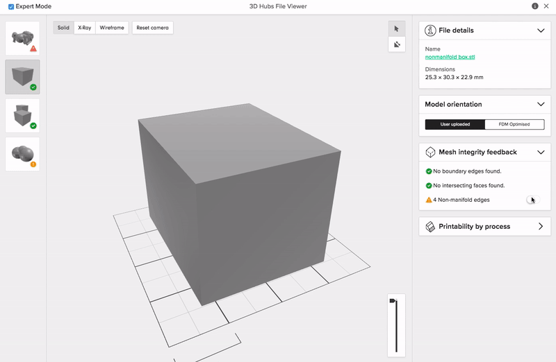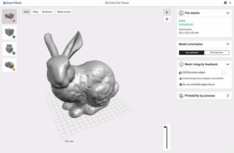On Protolabs Network, we offer handy tools to help you identify errors with your STL files. You can access the Printability Analyser by clicking “View in 3D” in the checkout.