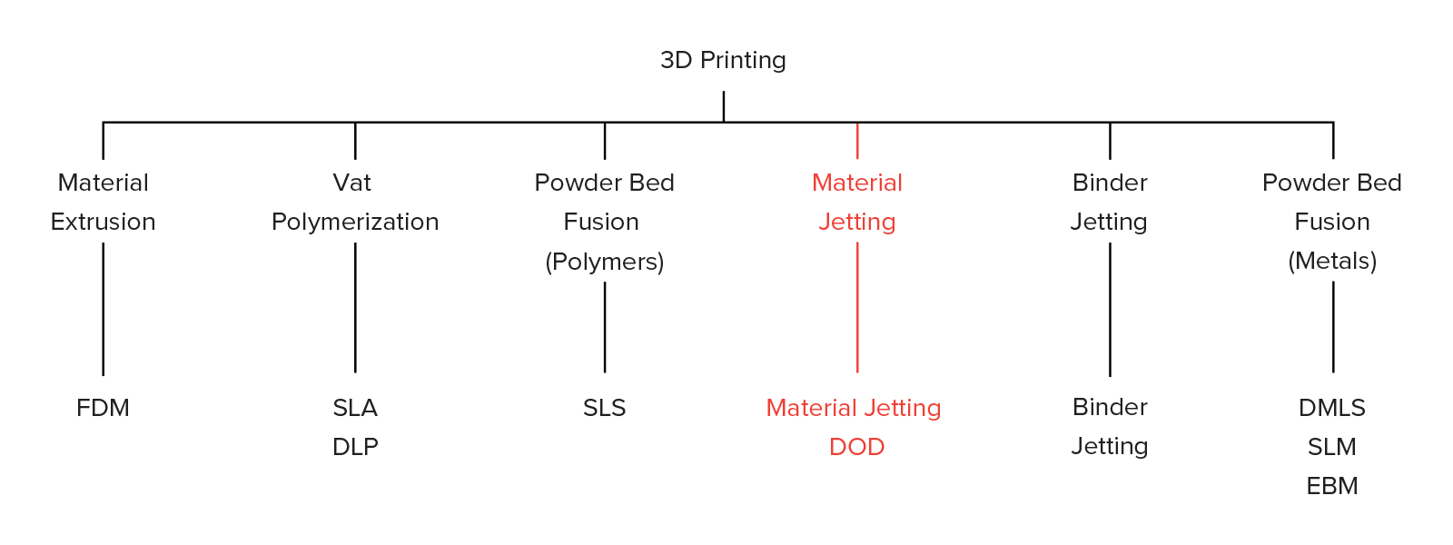 A variation of the MJ process uses Drop-On-Demand (DOD) printheads to dispense viscous liquids and create wax-like parts. DOD is used almost exclusively for manufacturing investment casting patterns though and for this reason we will not discuss it here further.